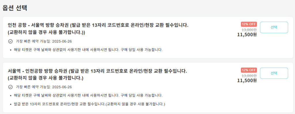 트립닷컴에서 AREX 직통열차를 검색하면 총 3개의 상품이 나옵니다. 모두 같은 직통열차 티켓이기에 이 중에서 가장 저렴한 11,500원짜리 상품을 구매하면 됩니다.